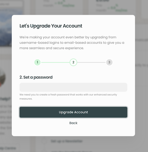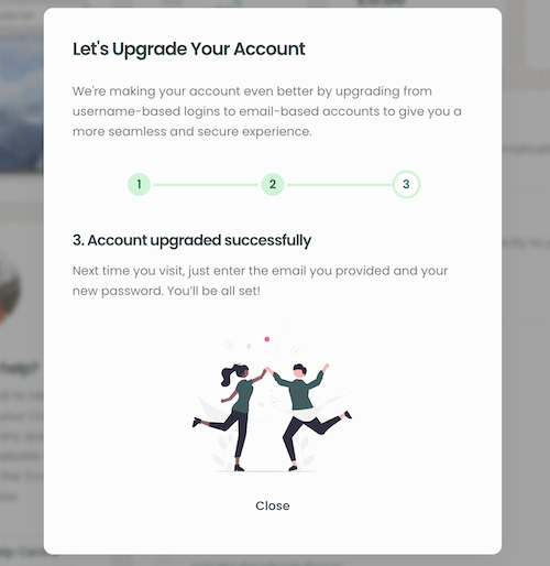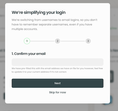 When your account is ready to be updated, you will see a new pop-up notification after logging in as normal. The pop-up is a quick 3-step process as shown in the example below.