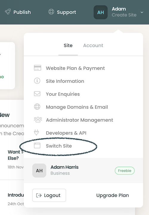 Once you have updated multiple Create accounts to your email login, you can easily switch between them by clicking the account drop-down menu and clicking the new Switch Site option.